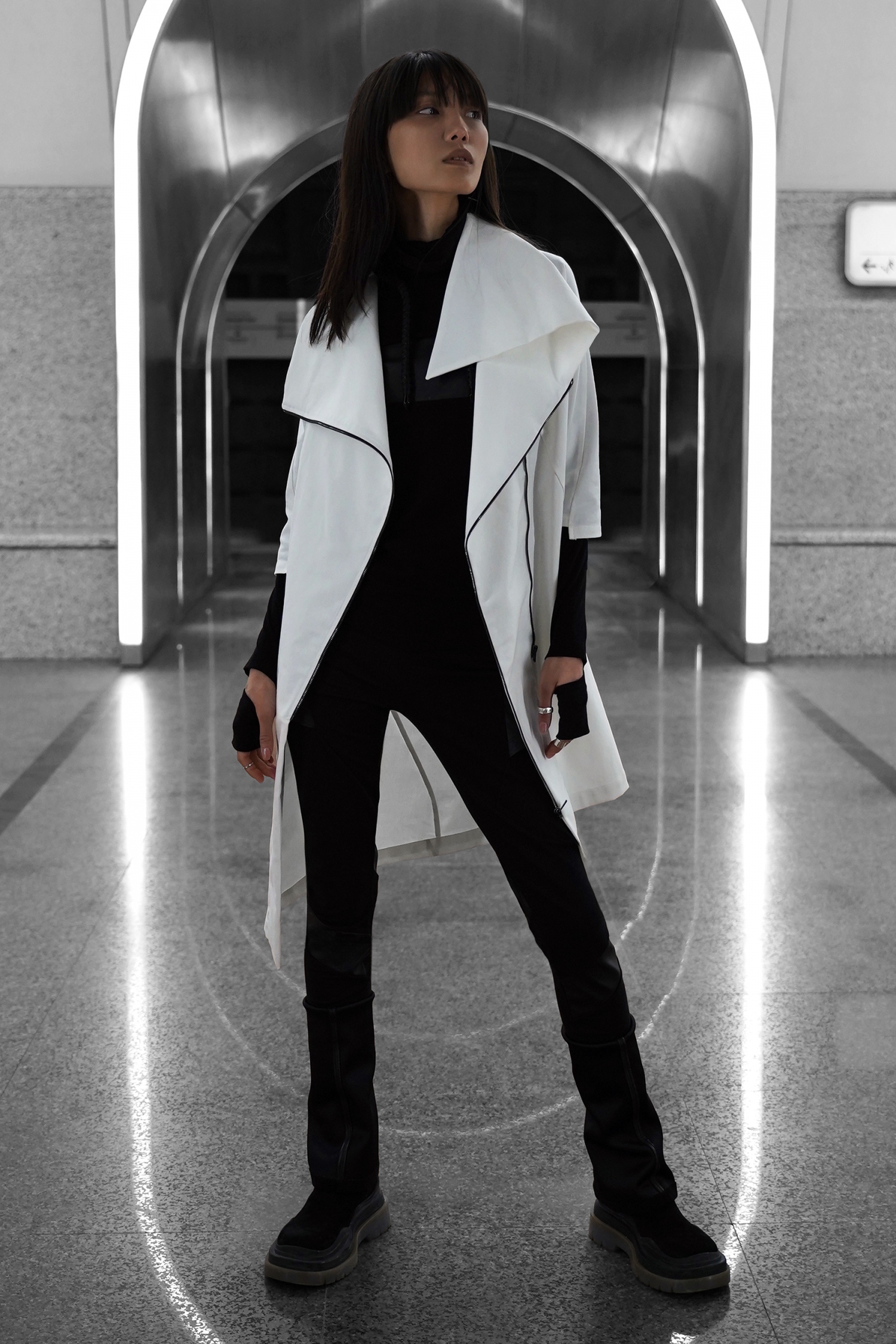 Необычная застежка с двумя молниям позволяет носить кардиган двумя способами.