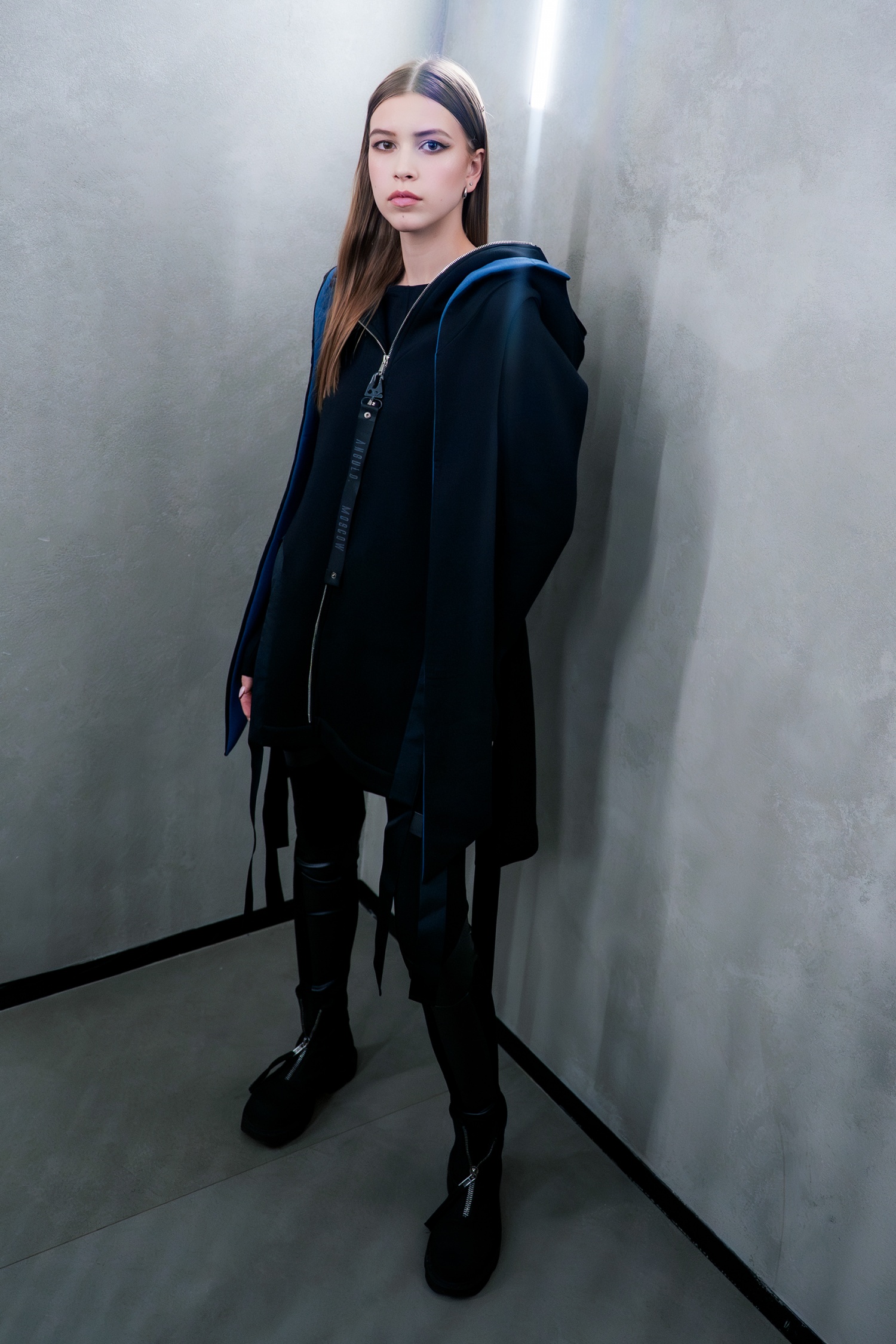 Кардиган свободного кроя на молнии, с двумя карманами и объемным капюшоном, декорирован широкими лентами на спинке и полочке.