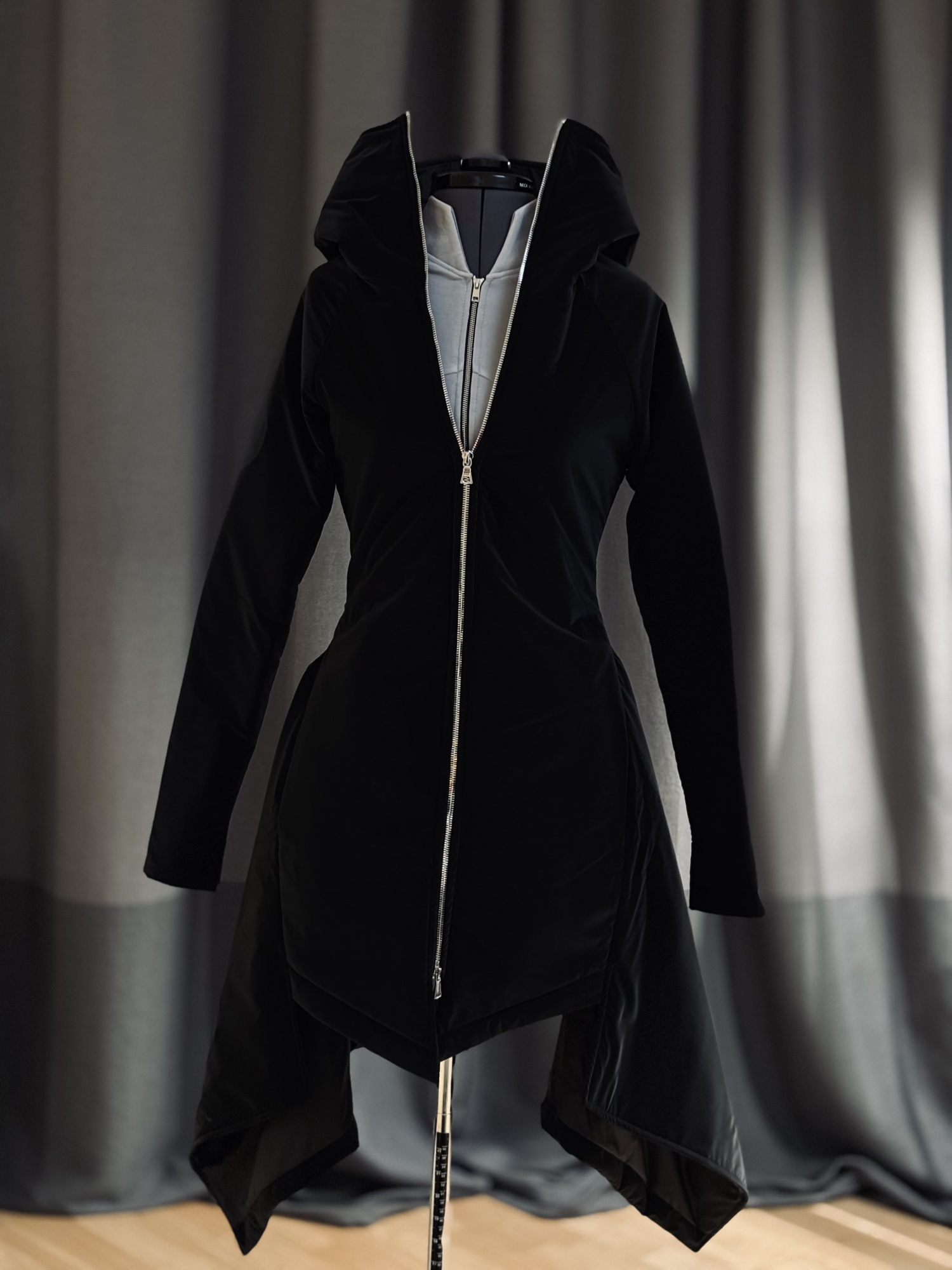 Зимняя куртка из нежнейшего материала с бархатистой текстурой. Приталенный силуэт и пышная юбка создают женственный образ, а объёмный капюшон с логотипом добавляет стиля.