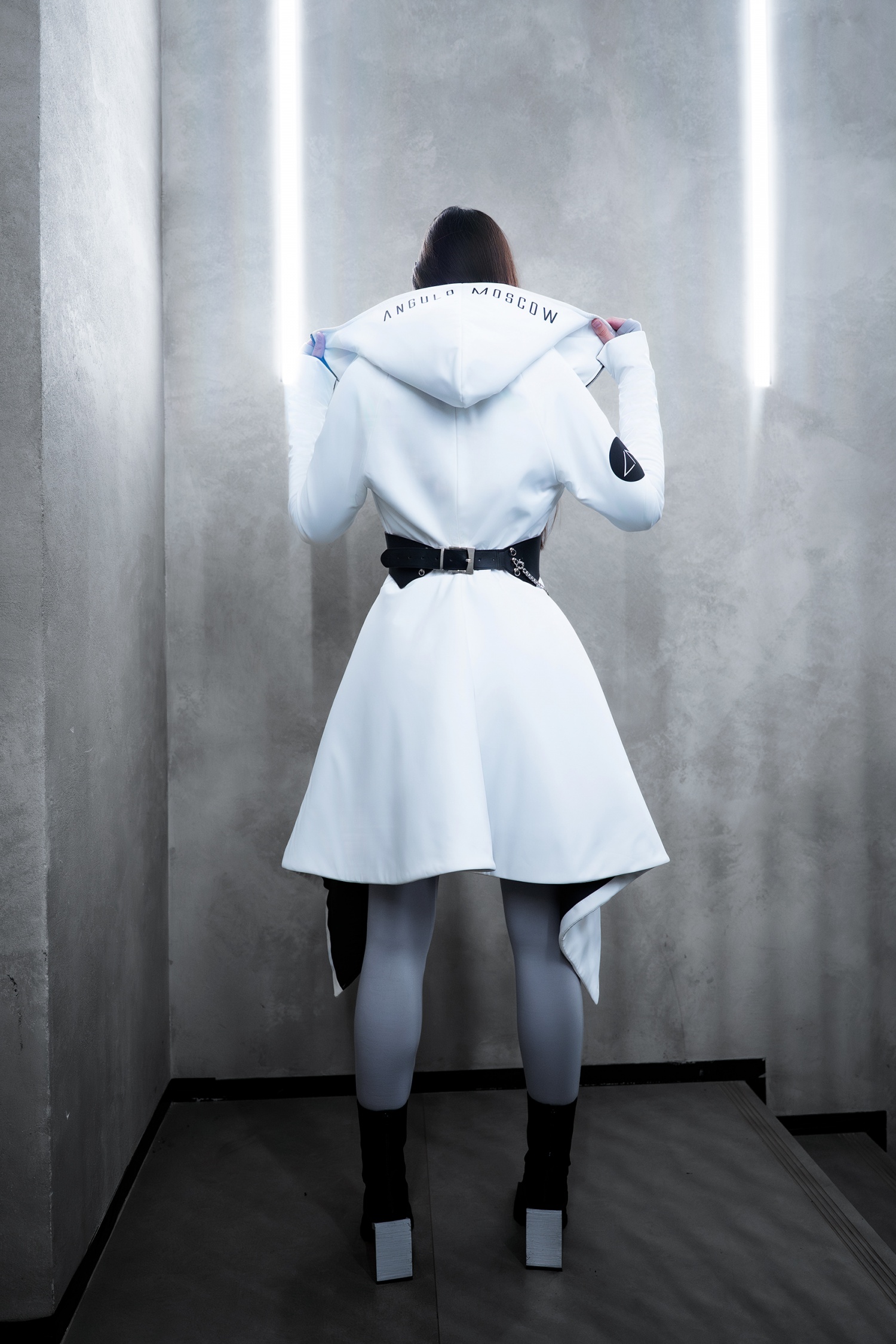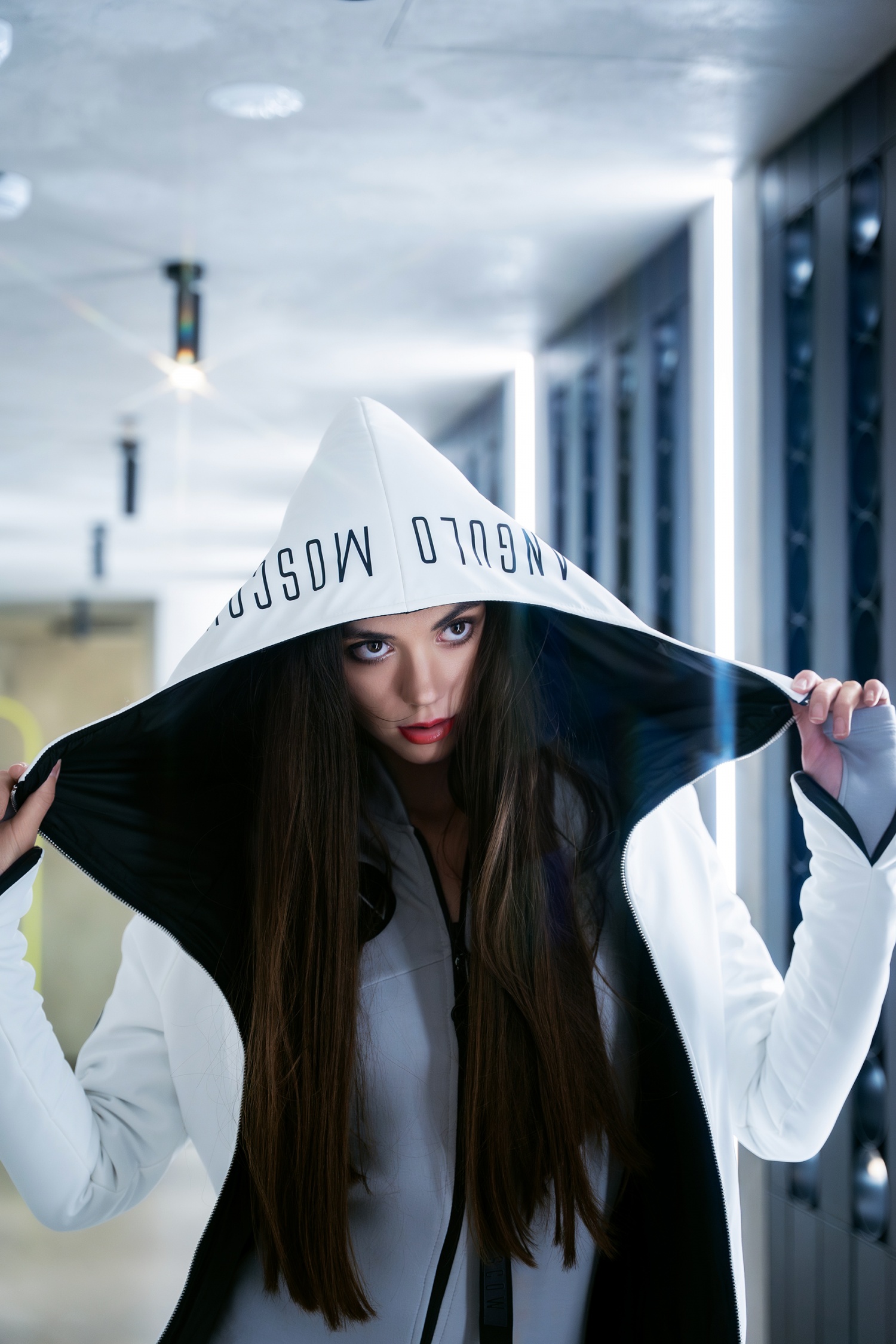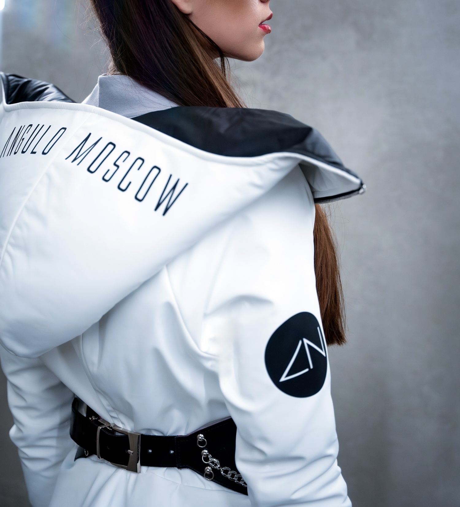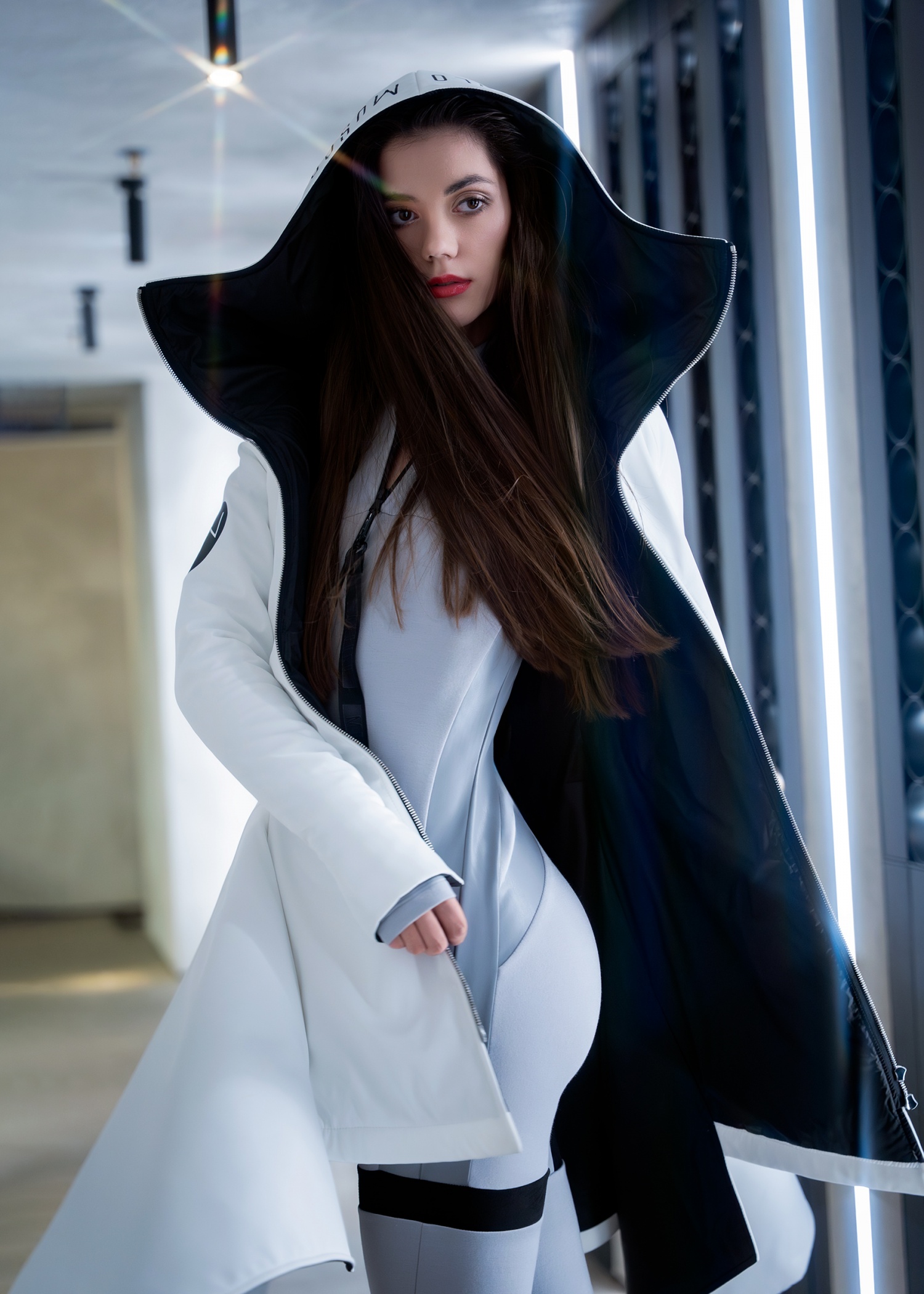 Зимняя куртка из нежнейшего материала с бархатистой текстурой. Приталенный силуэт и пышная юбка создают женственный образ, а объёмный капюшон с логотипом добавляет стиля.