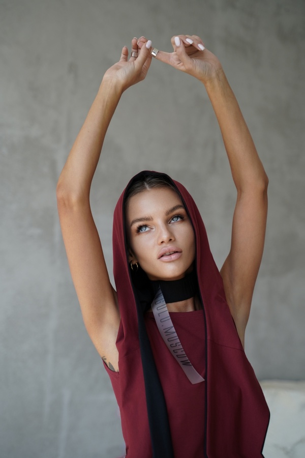Оригинальное бордовое асимметричное платье с открытой спиной. В комплекте съемный чёрно-бордовый капюшон-снуд, который можно надеть тремя способами: в два обхвата вокруг шеи, перекинуть за спину или оставить в роли аксессуара спереди.