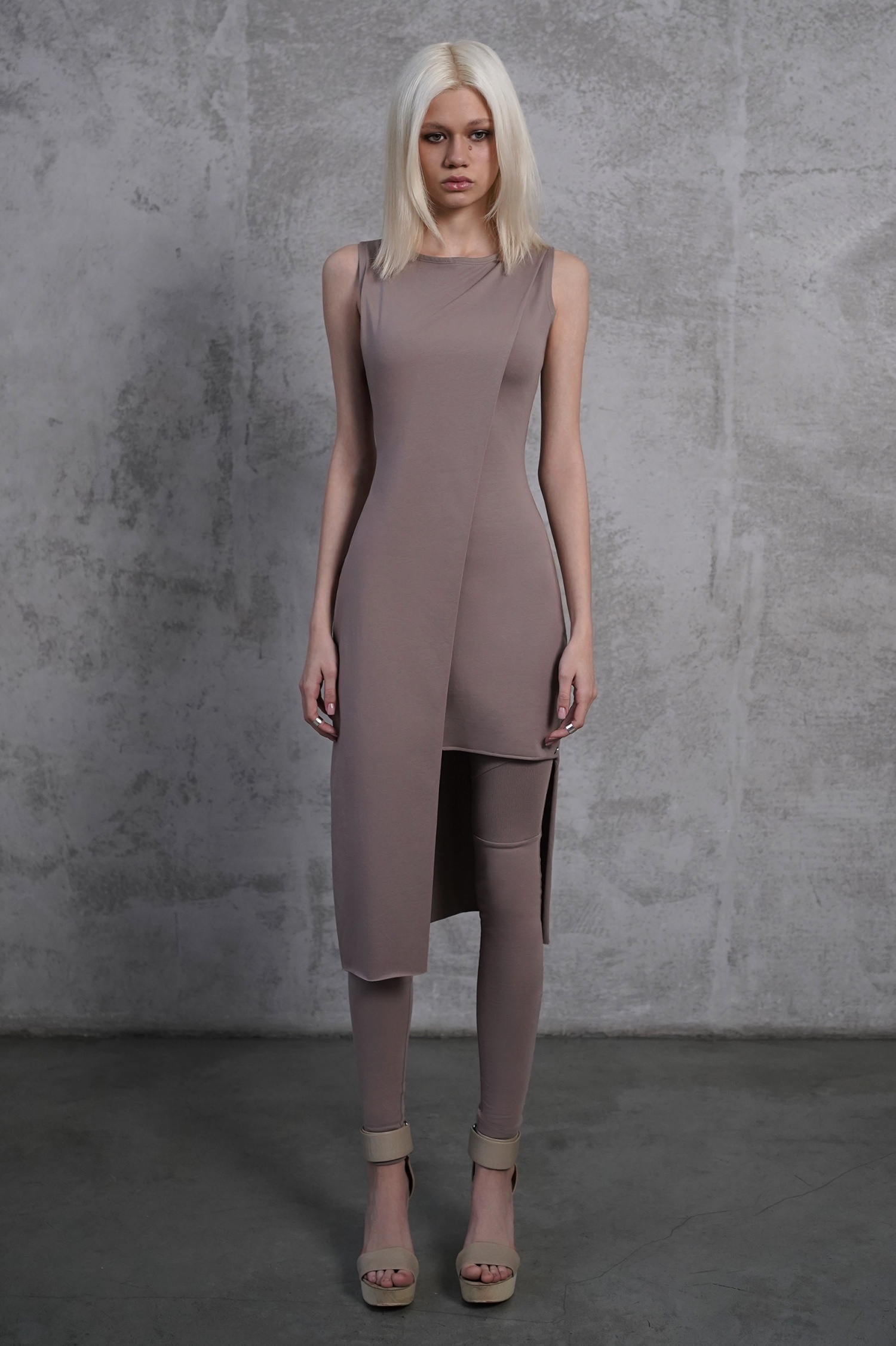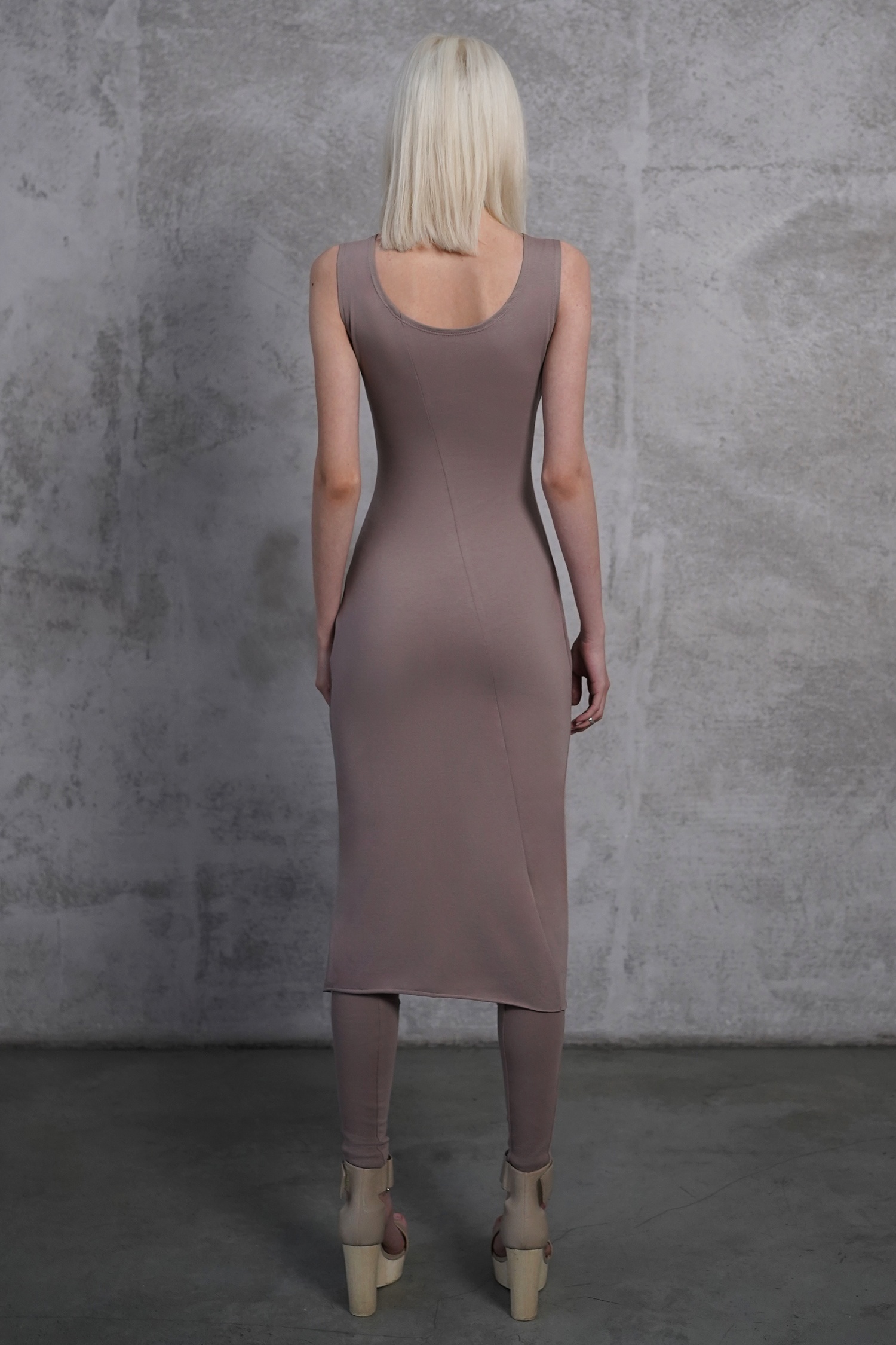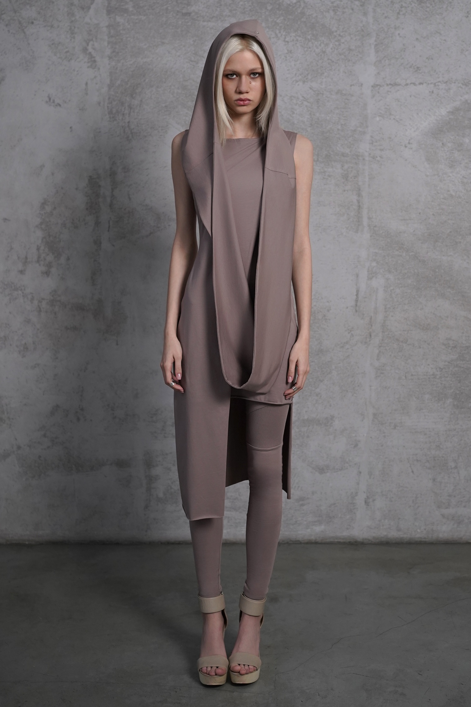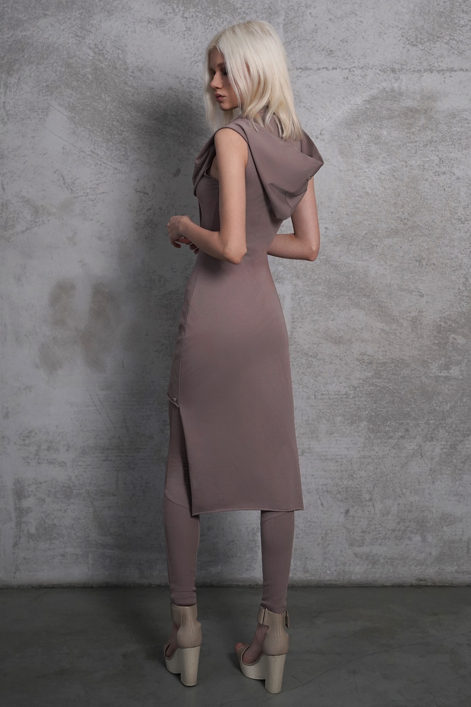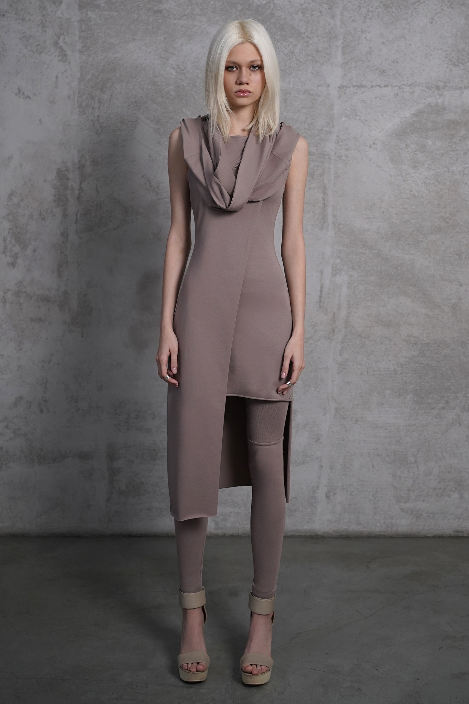 Оригинальное асимметричное платье с открытой спиной. В комплекте съемный капюшон-снуд, который можно надеть тремя способами: в два обхвата вокруг шеи, перекинуть за спину или оставить в роли аксессуара спереди.
