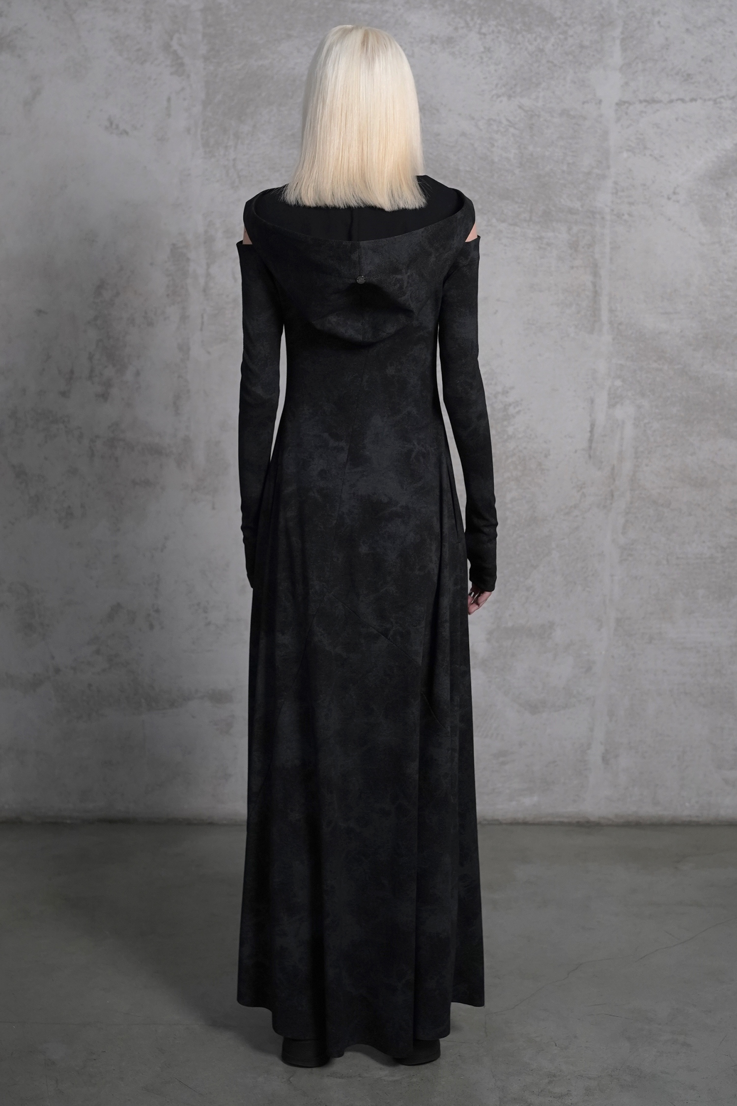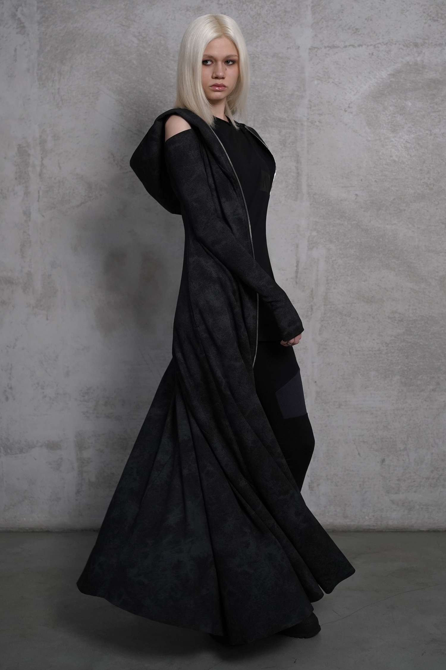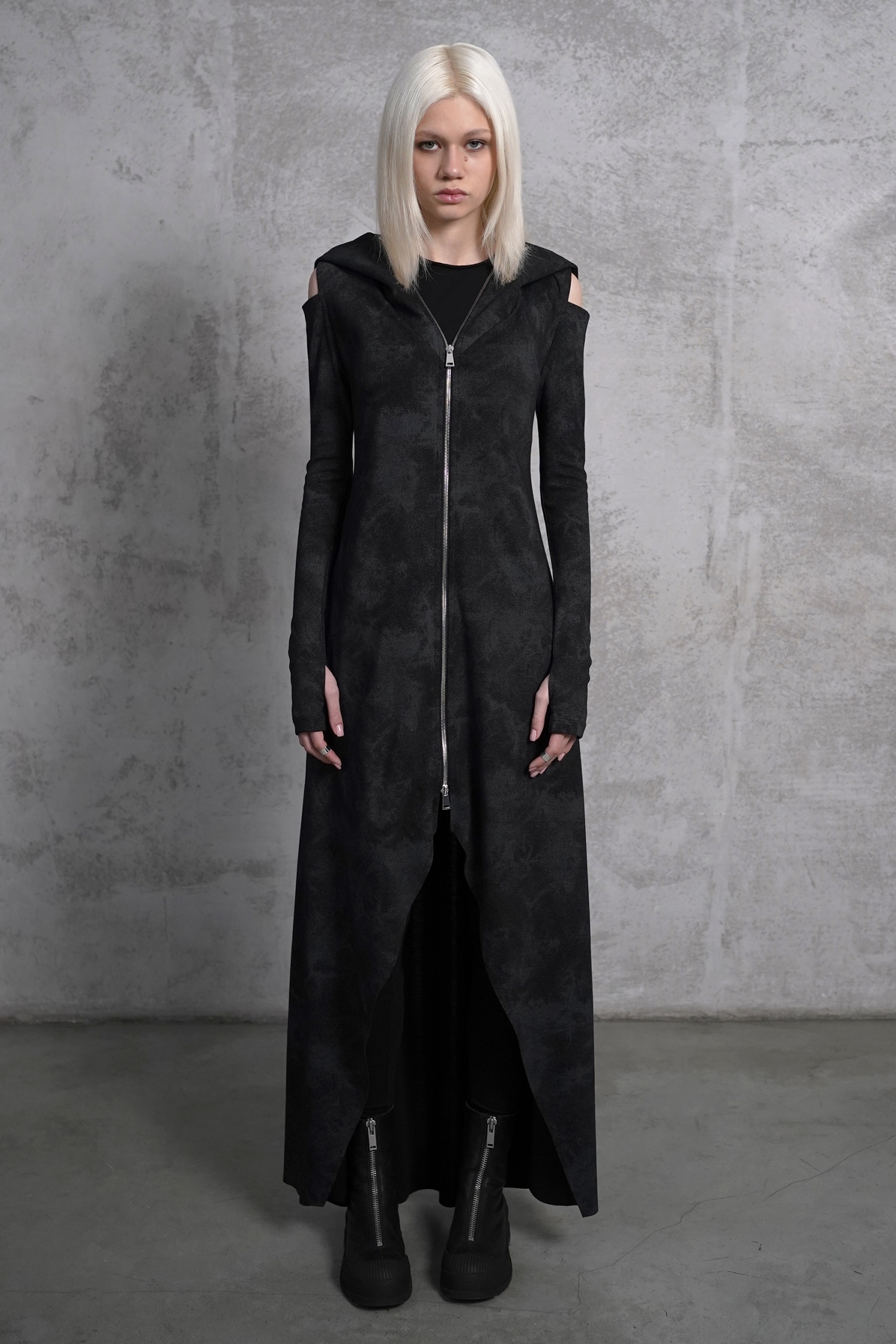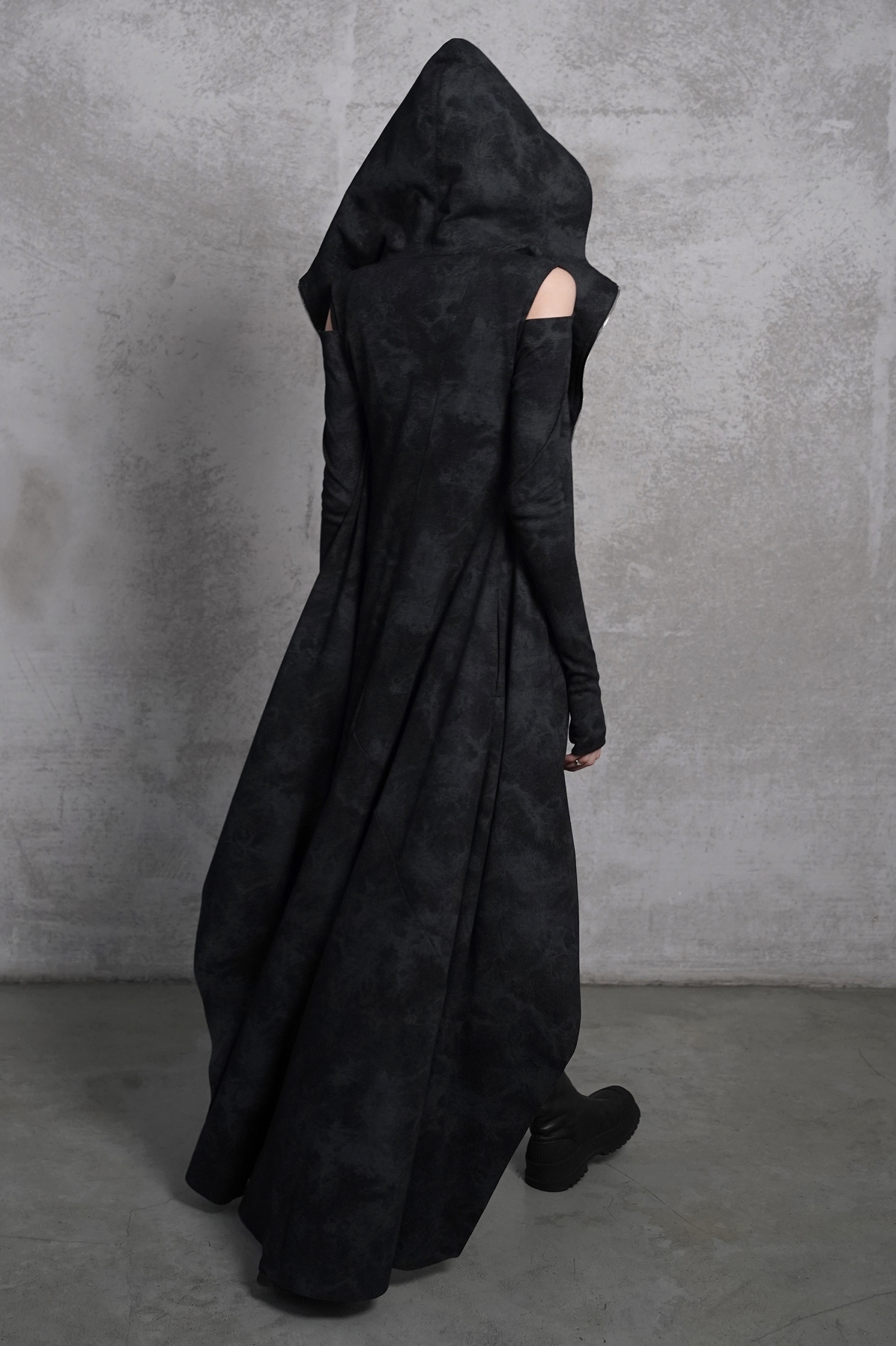 Концептуальное платье-кардиган в пыльном чёрно-сером цвете на молнии дополнено объемным капюшоном, разрезами на рукавах, глубокими карманами и вырезами для большого пальца в манжетах.
