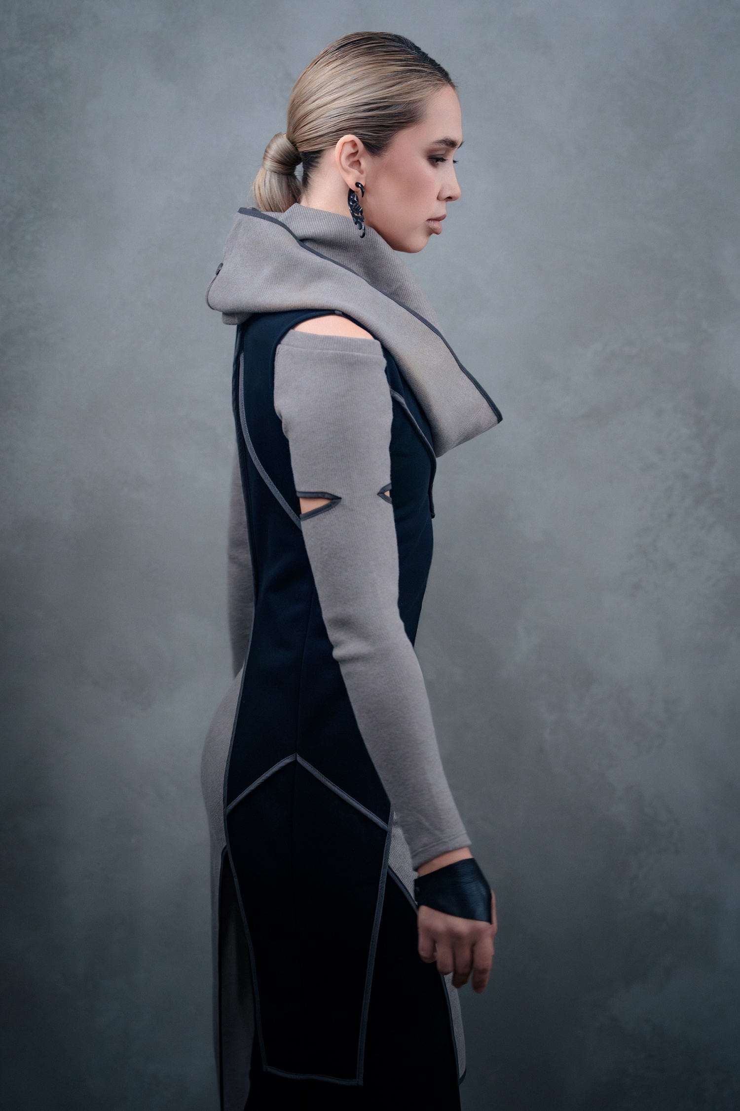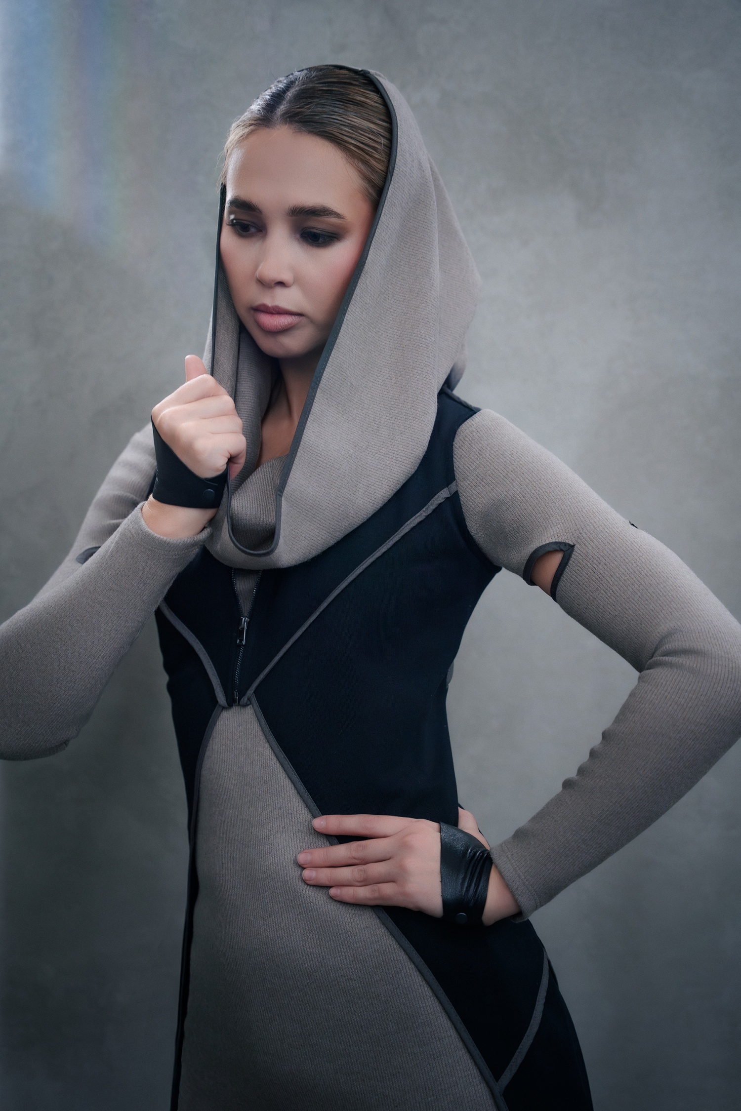 Объемный капюшон можно стянуть на плечи или носить в качестве объемного хомута.