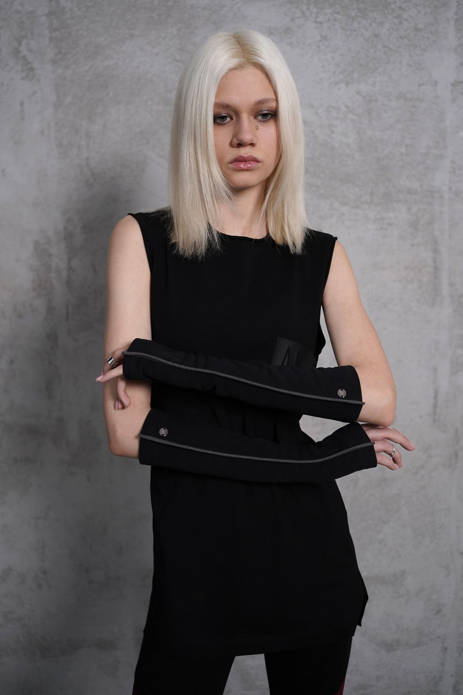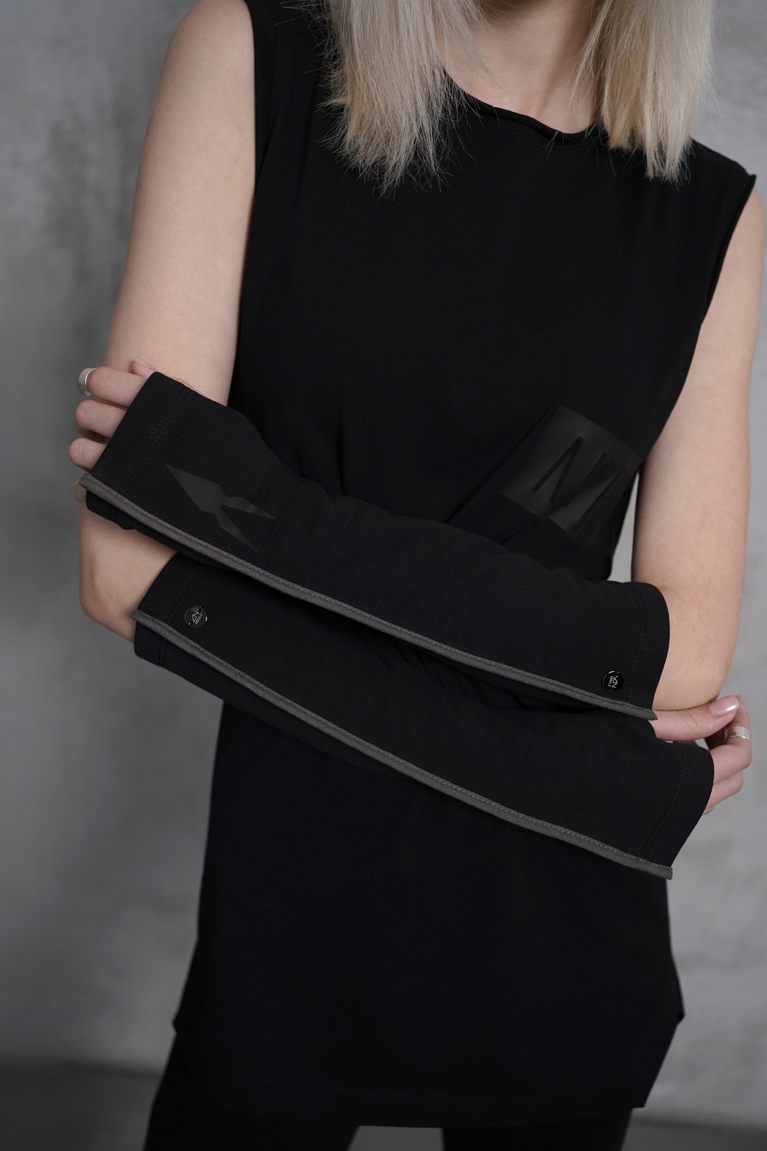 Высокие перчатки митенки выполнены из плотного хлопкового трикотажа черного цвета.