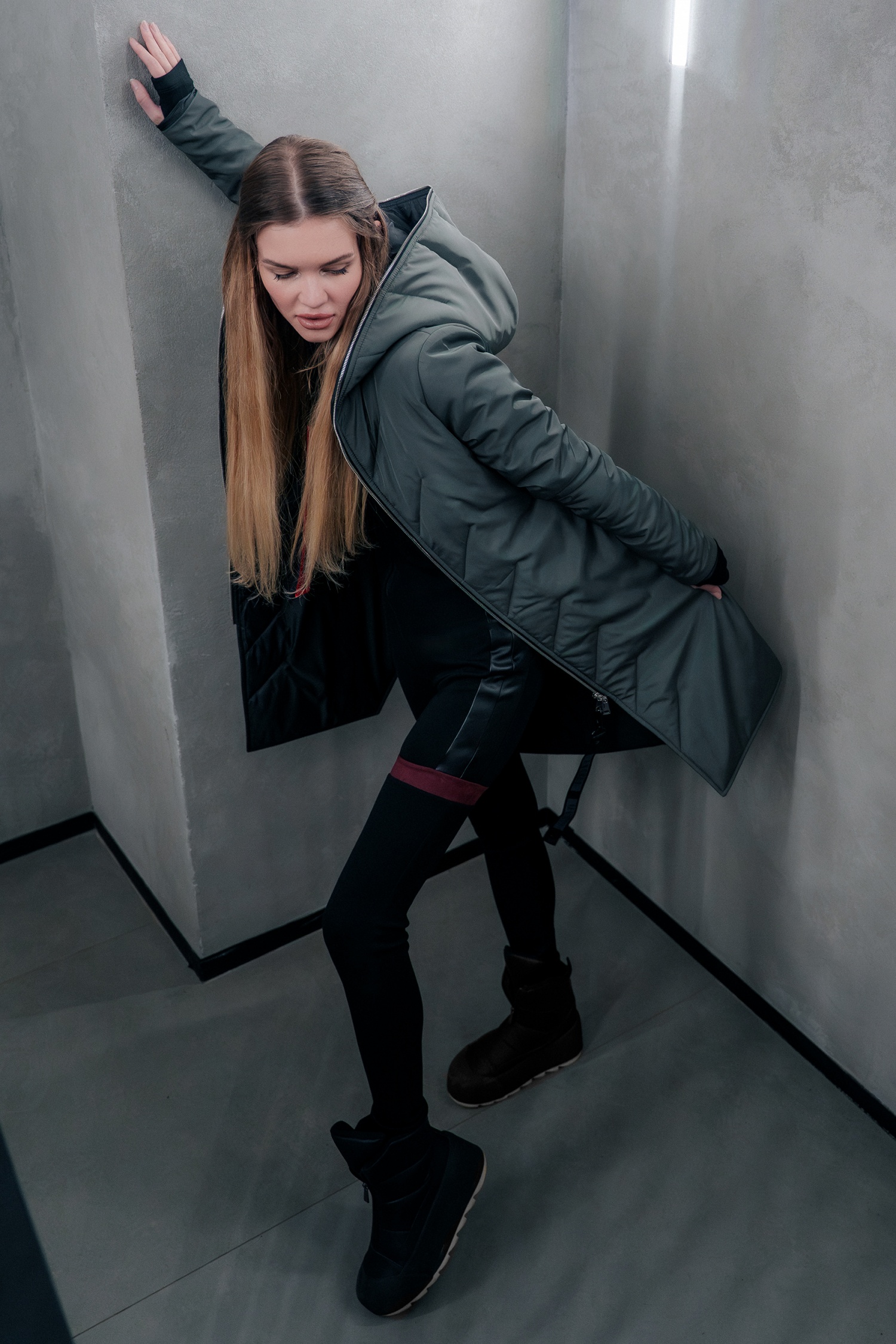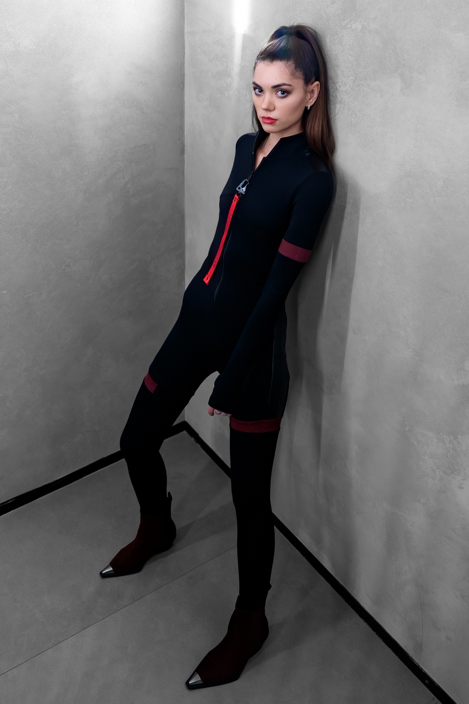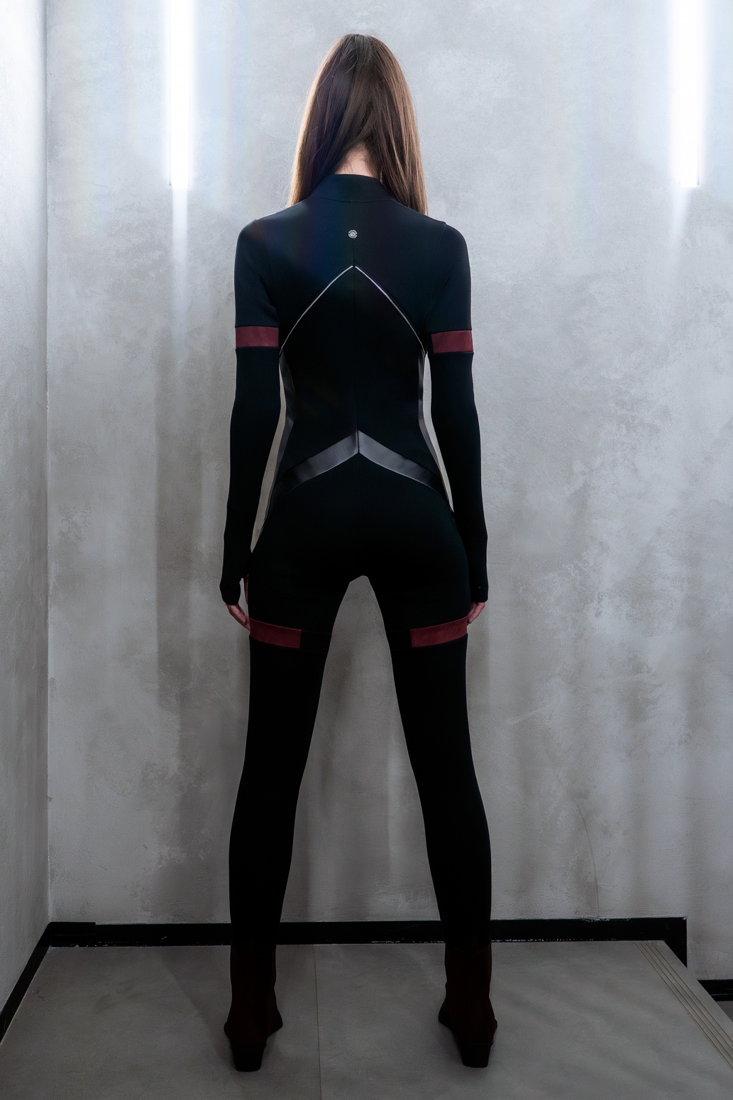 Эффектный и при этом тёплый комбинезон чёрного цвета выполнен из нежной, словно шёлк, плотной дышащей вискозы, контрастные вставки из эко-замши. На спинке, по бокам и на плечах декоративные вставки из искусственной кожи, комбинированный воротник из вискозы и эко кожи, приталенный силуэт, водонепроницаемая молния.