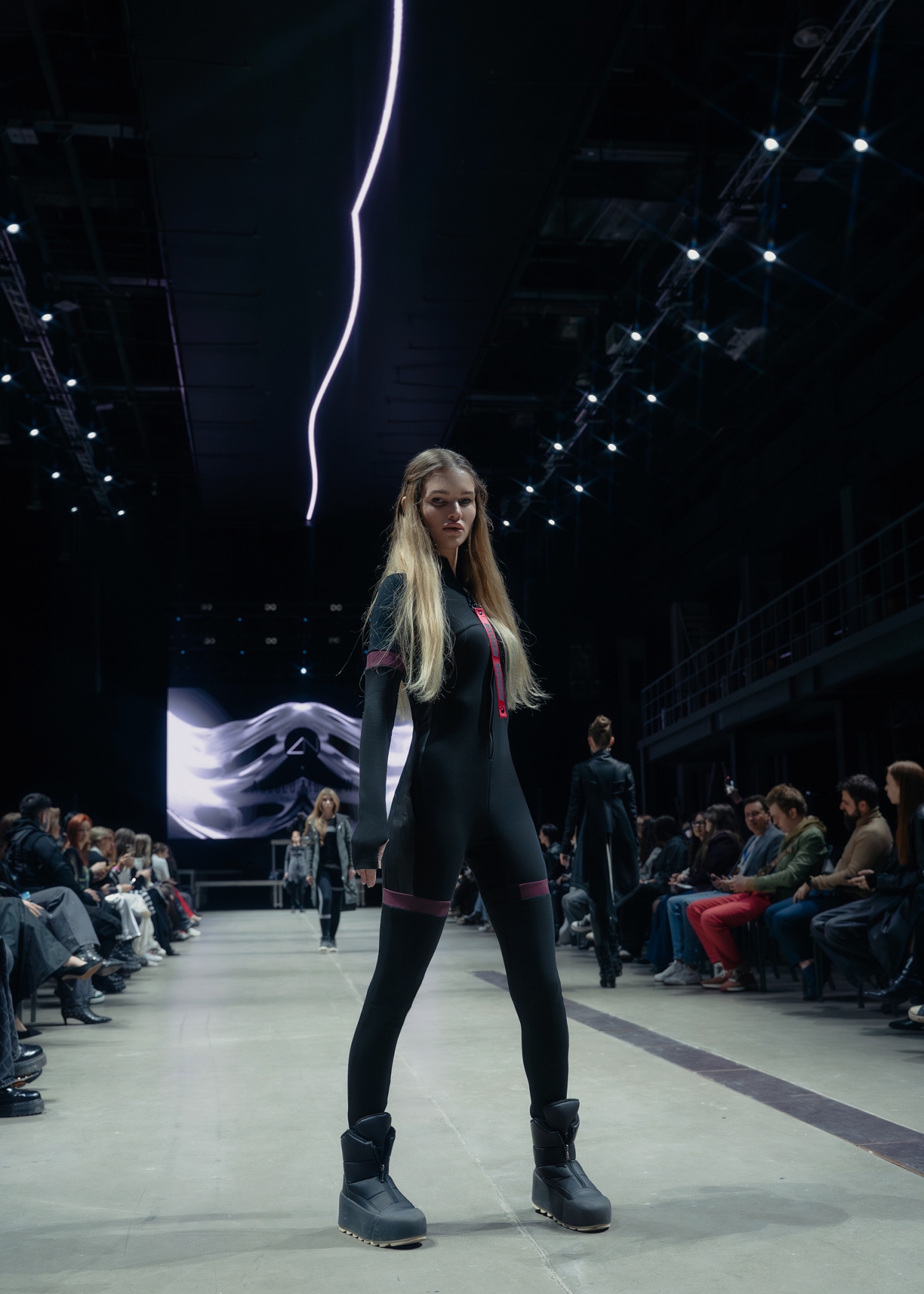 Эффектный и при этом тёплый комбинезон чёрного цвета выполнен из нежной, словно шёлк, плотной дышащей вискозы, контрастные вставки из эко-замши. На спинке, по бокам и на плечах декоративные вставки из искусственной кожи, комбинированный воротник из вискозы и эко кожи, приталенный силуэт, водонепроницаемая молния.