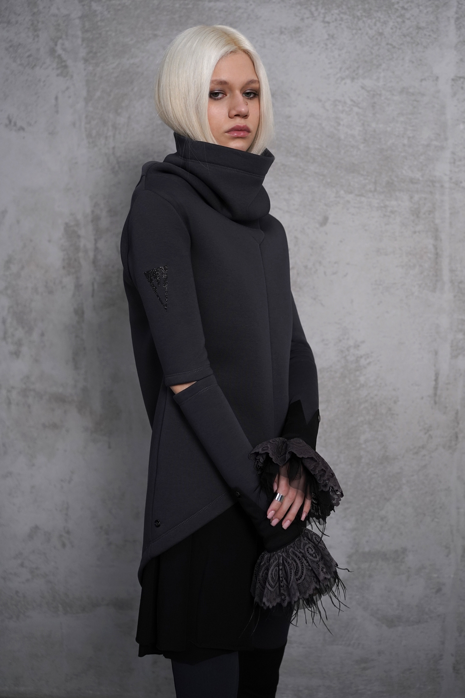 Уютный и теплый свитшот с разрезами на рукавах изготовлен из хлопкового футера с начесом.