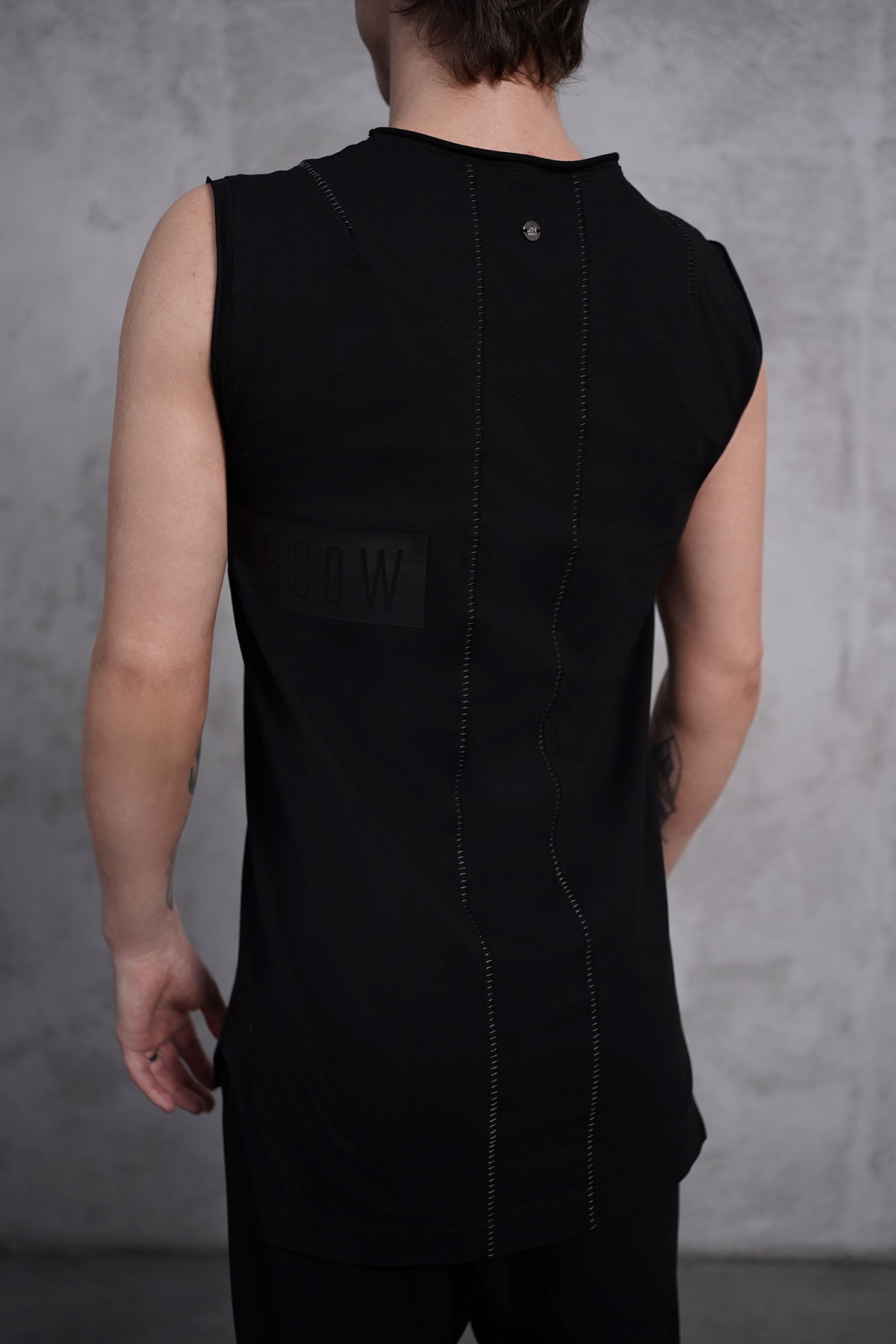 Безрукавка прямого кроя, удлиненная спинка и полочка, декоративные швы цвета хаки.