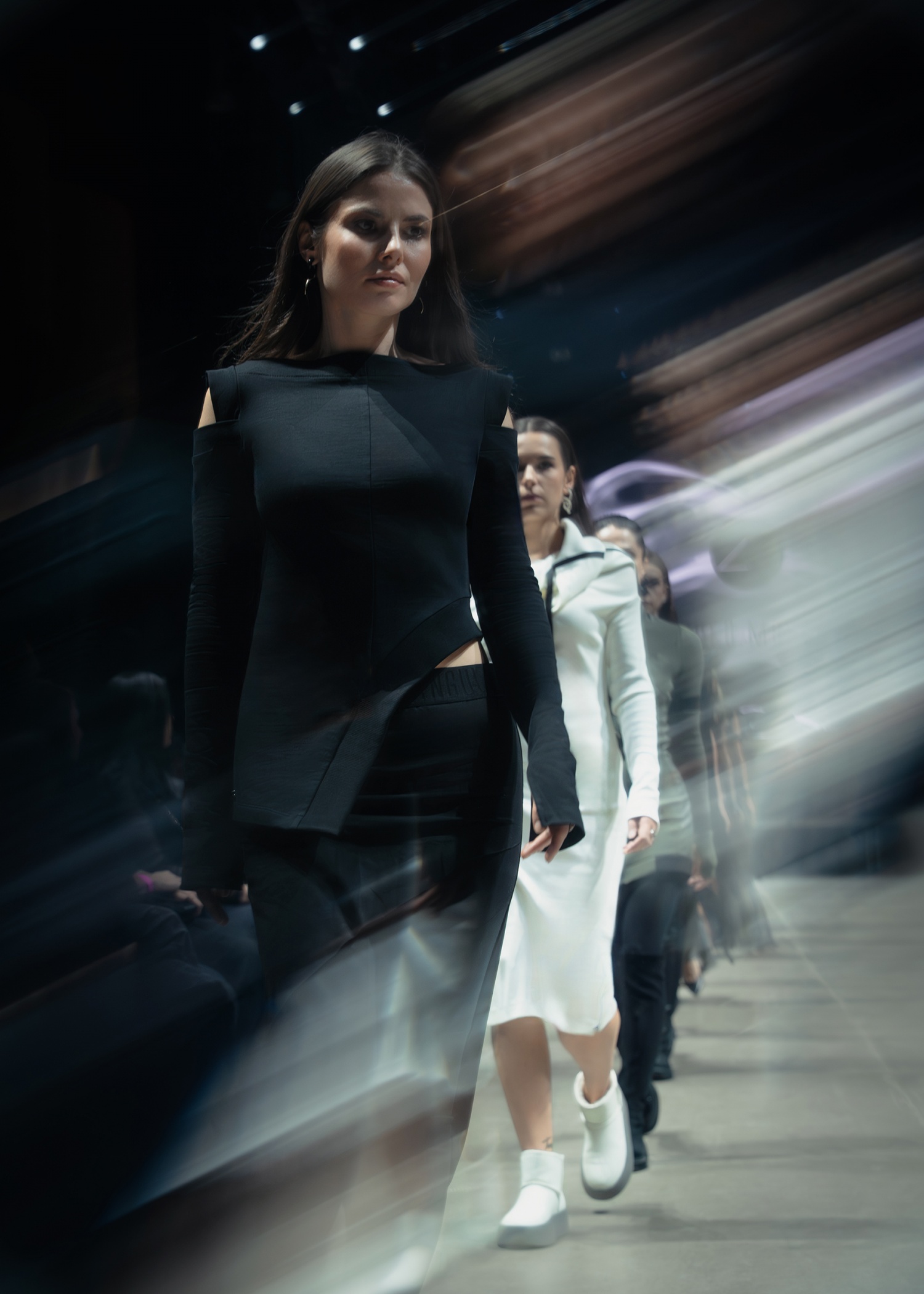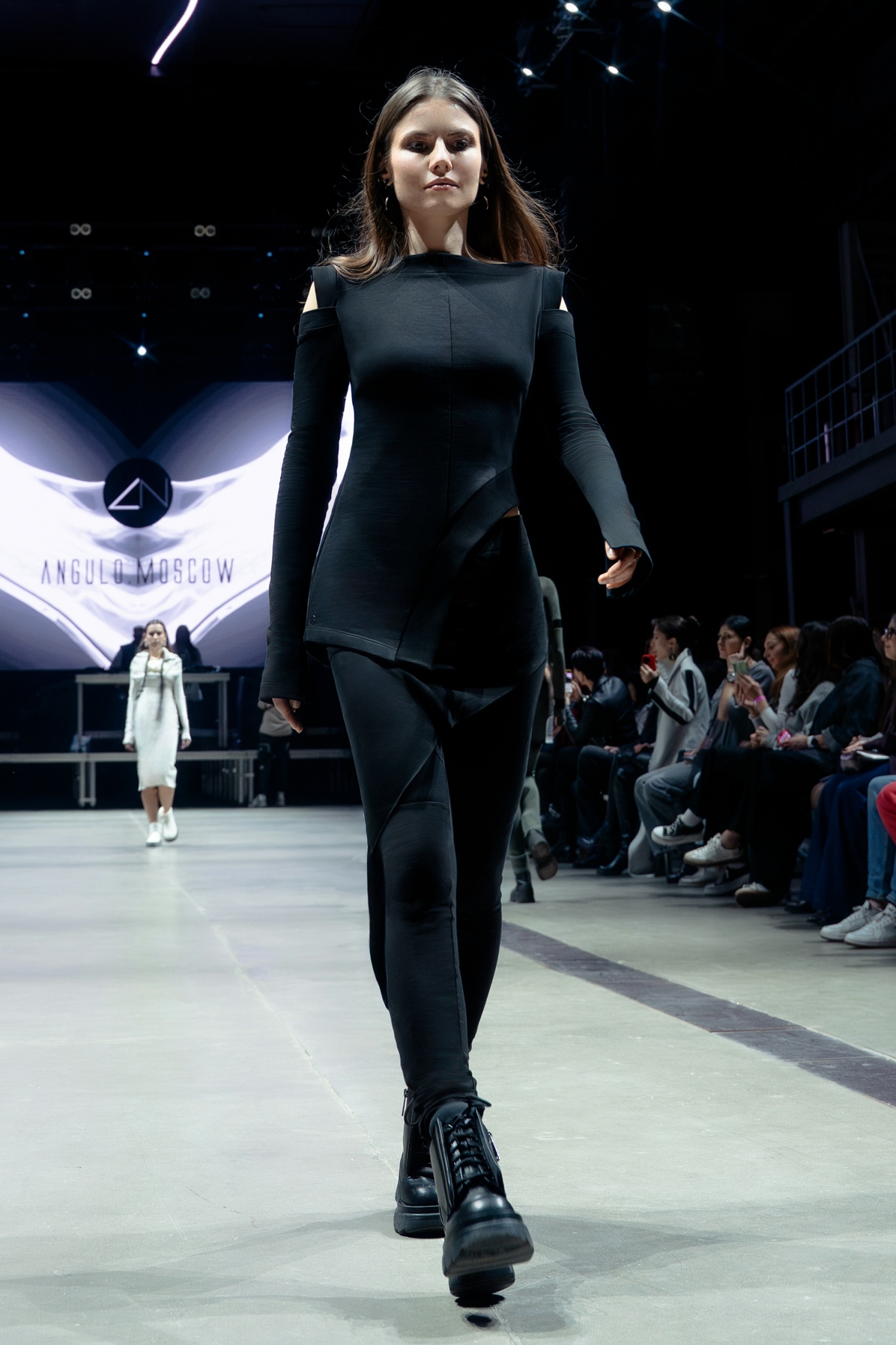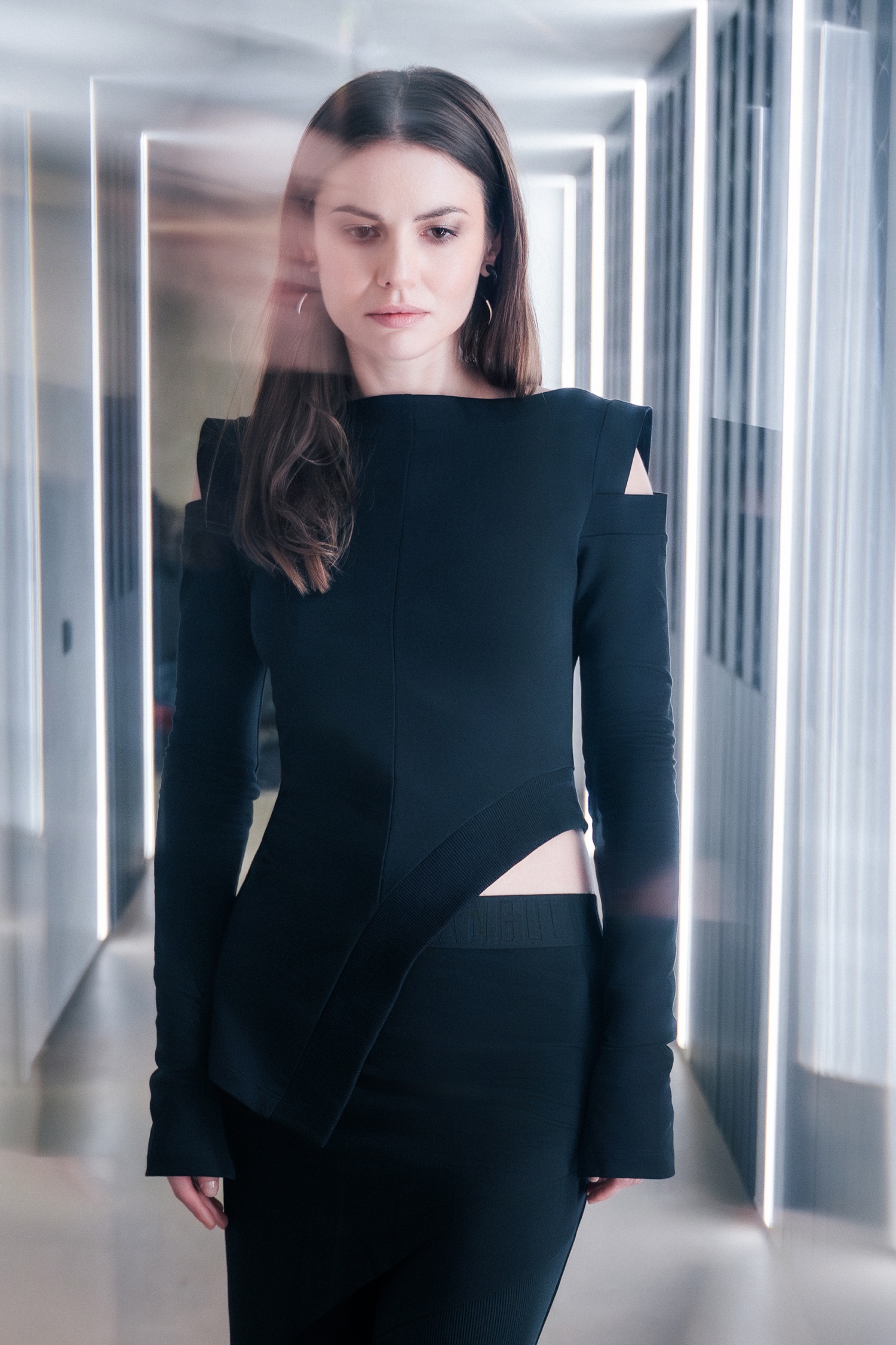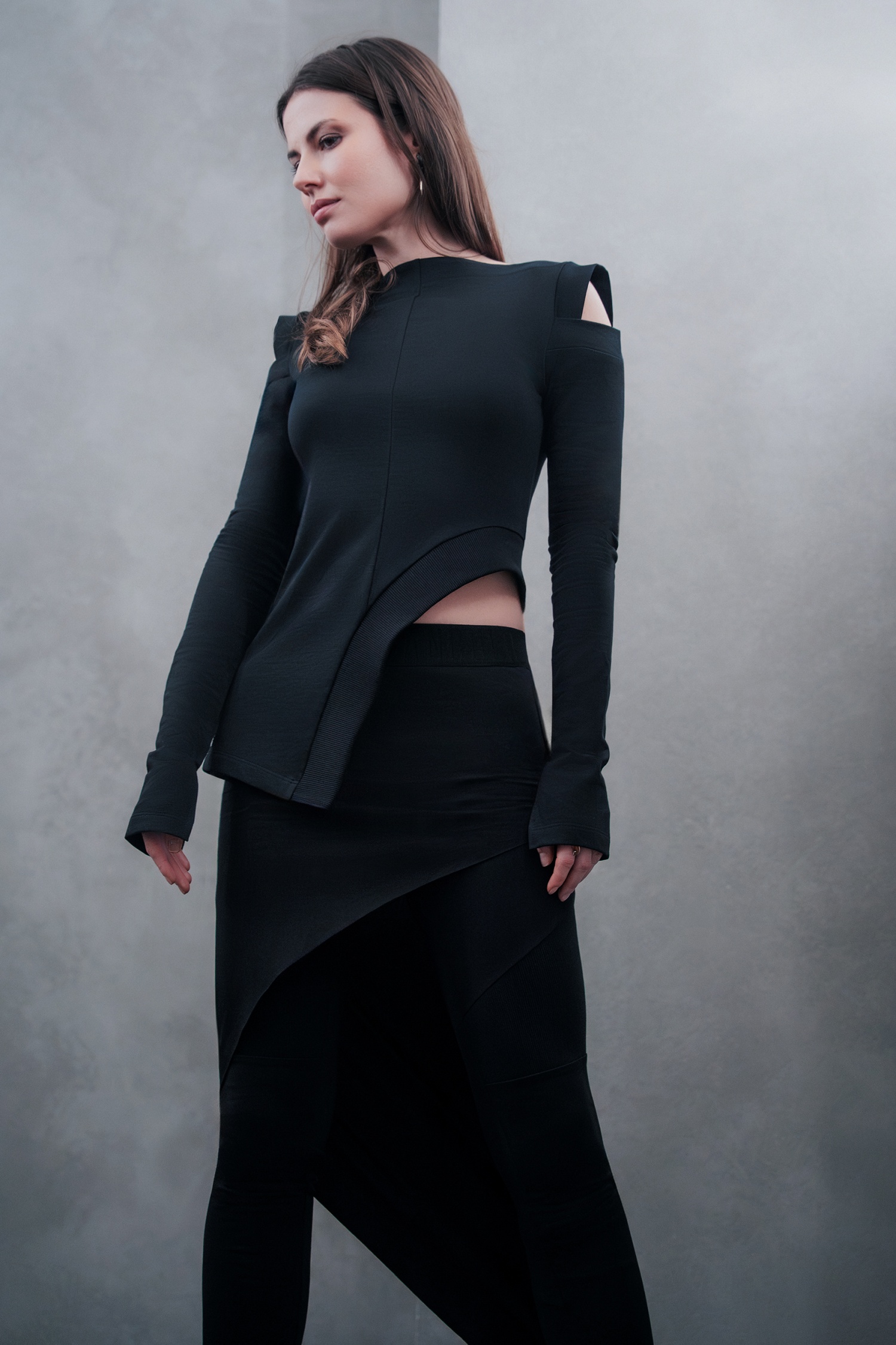 Необычный дизайн кроп-топа с длинными рукавами создан благодаря асимметричному крою.