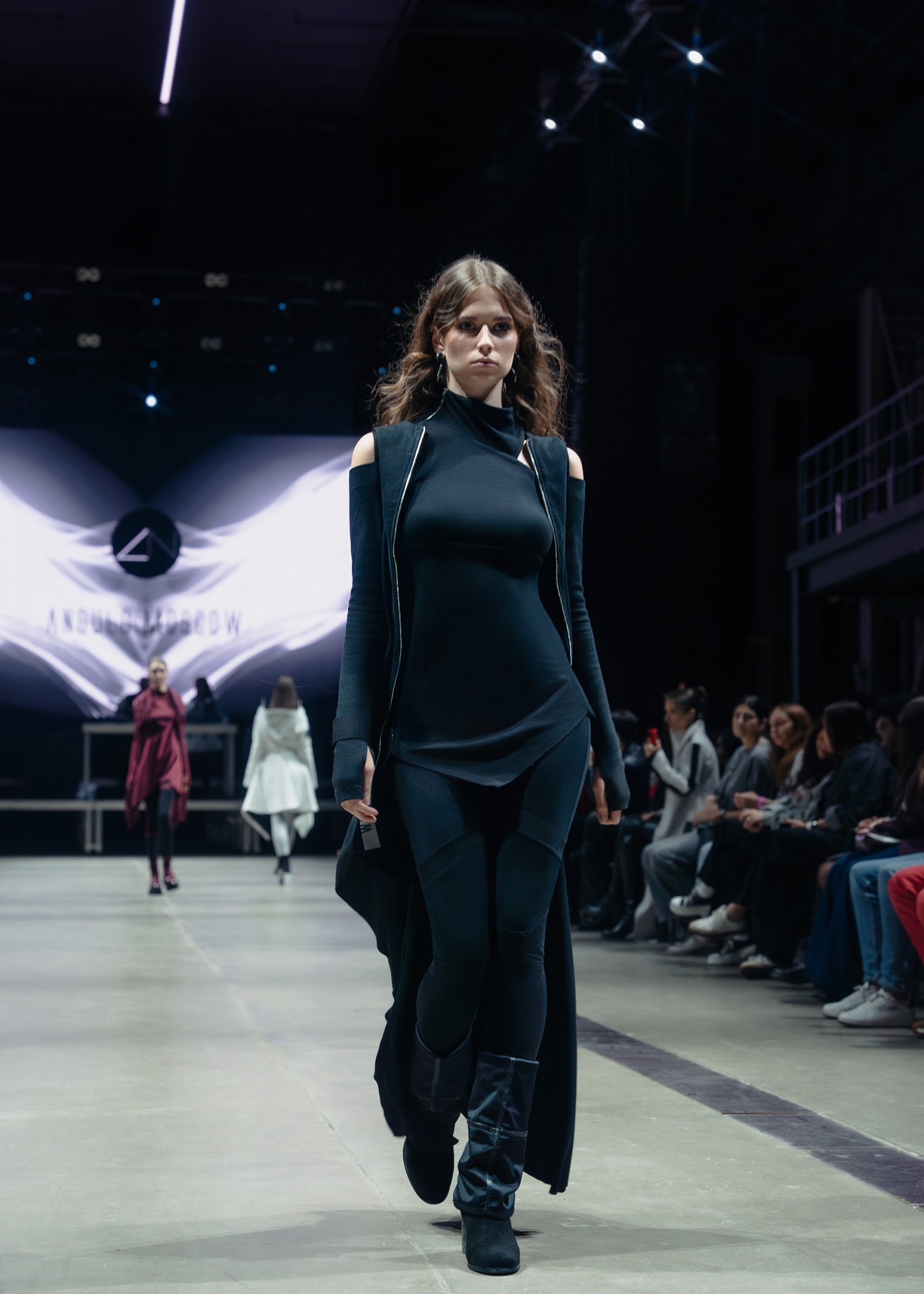 Асимметричная туника с открытым плечом, приталенный силуэт, удлиненная спинка, геометричный вырез спереди.
