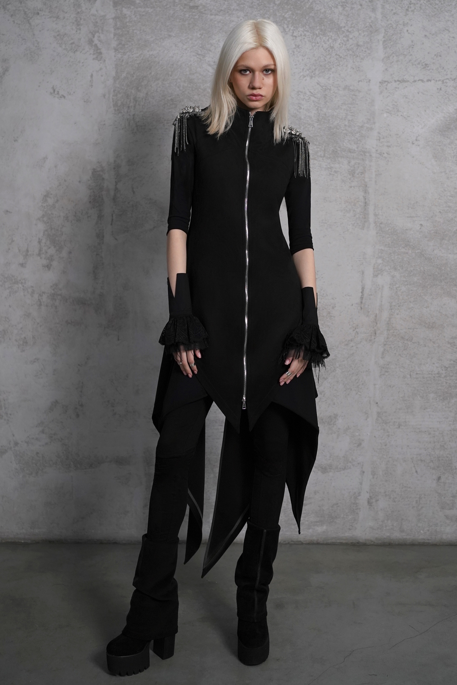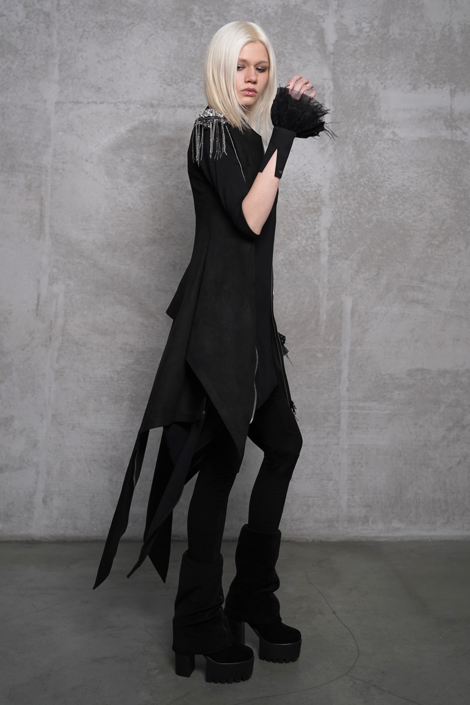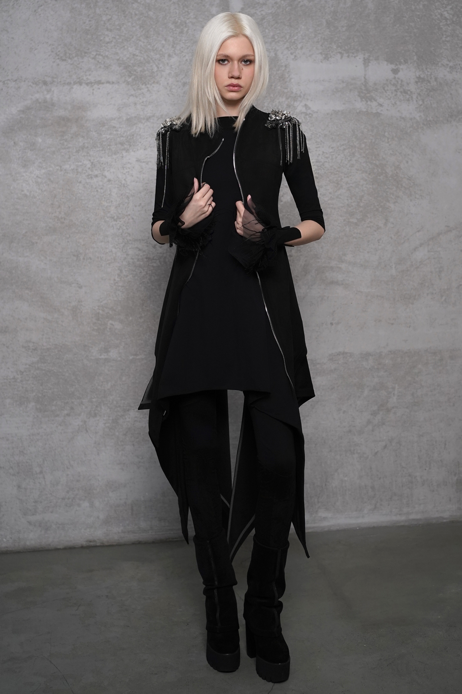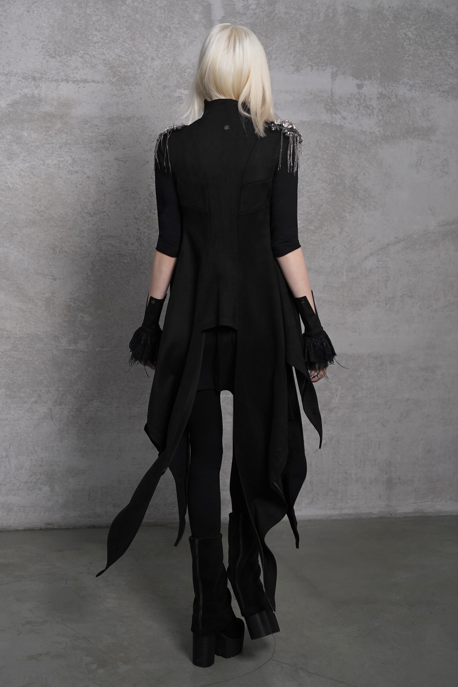 Эффектный воротник стойка необычной геометрии, асимметричные полочка и спинка, удлиненные концы которой притягивают взгляды и придают жилету невероятную динамичность.